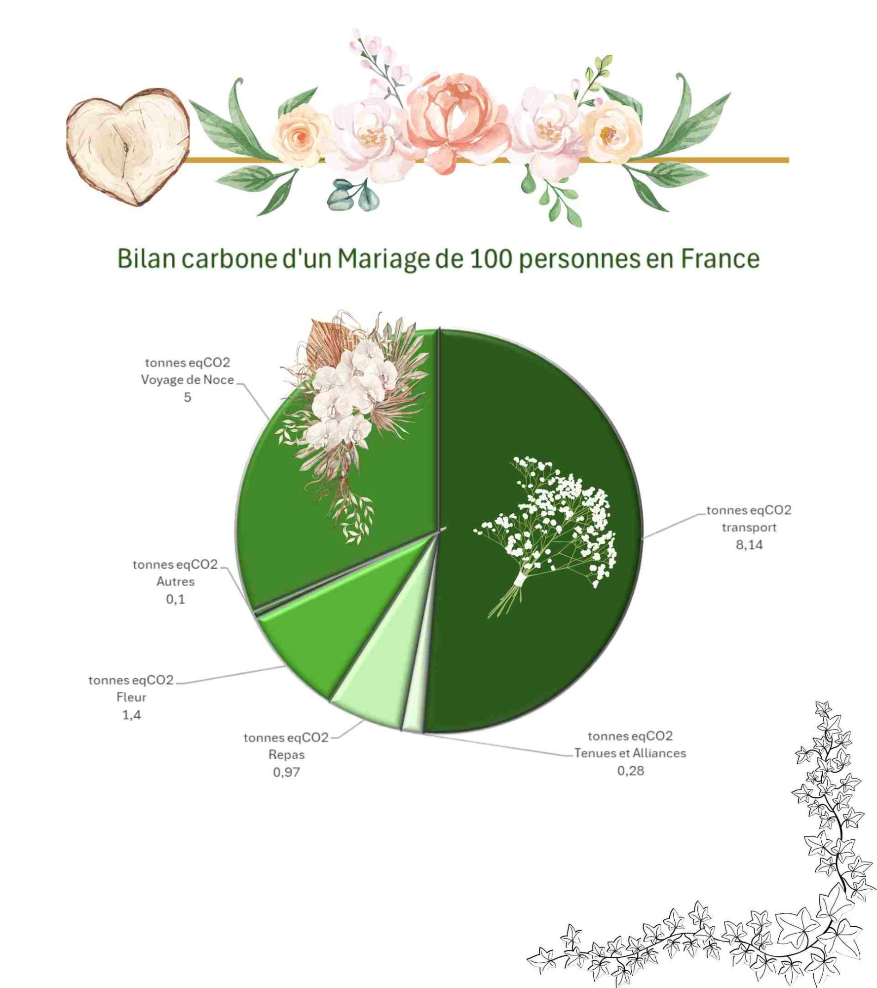 L’Insee estime à ce jour à 242 000 le nombre de mariages en France pour l’année 2023. Même si le nombre de mariages est en déclin progressif, leur impact reste significatif sur l’environnement. En effet, selon l’ouvrage de Claire Tranier “Mariage Green”, un mariage représenterait environ pour 100 invités 15 tonnes d’eqCO2 (en sachant que l’empreinte carbone annuelle moyenne d’un Français représente 11 tonnes d’eqCO2 et qu’il faudrait la faire descendre à 2 tonnes d’eqCO2 afin de limiter le réchauffement climatique à +2°C d’ici 2100)